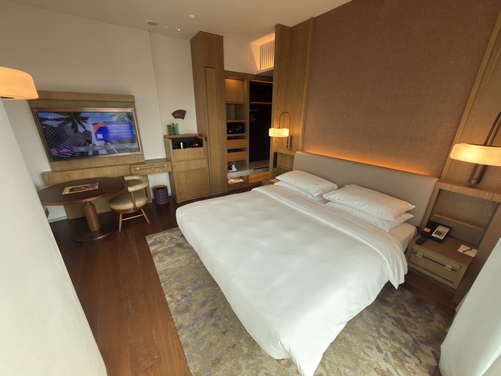 The corner deluxe room was spacious with tons of windows and thoughtful touches like motorized shades and built-in furniture. The bathroom was functional with good counter space and a bidet feature, though nothing spectacular.