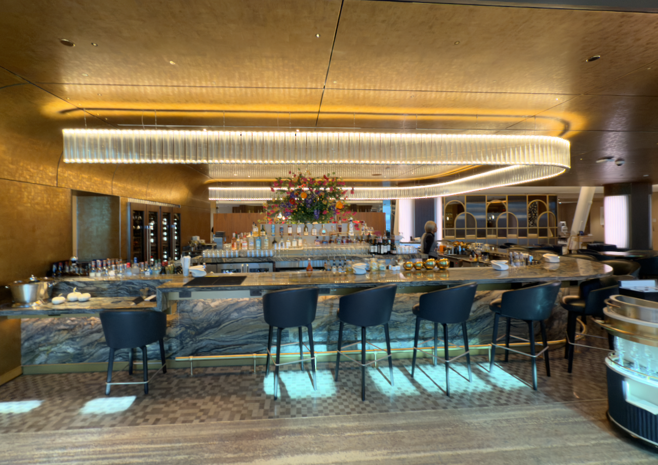 Connected to the Fireplace Lounge is the Icon Bar. It's inspired by Radio City Music Hall and serves elevated cocktails plus complimentary wines like Whitehaven Sauvignon Blanc. Premium spirits and wines cost extra but you can pay with cash or miles.